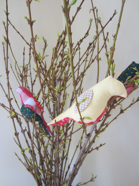 Waking up to birds chirping is one of the loveliest things about spring... which reminded me of these adorable fabric birds I pinned ages ago from Jen Loves Kev. The original idea/pattern is from Spool, and these are so fun because you can use up your pretty fabric scraps (I also picked up a few really inexpensive pieces from the remnant bin) and whip out a few rather quickly - and the possibilities are endless...