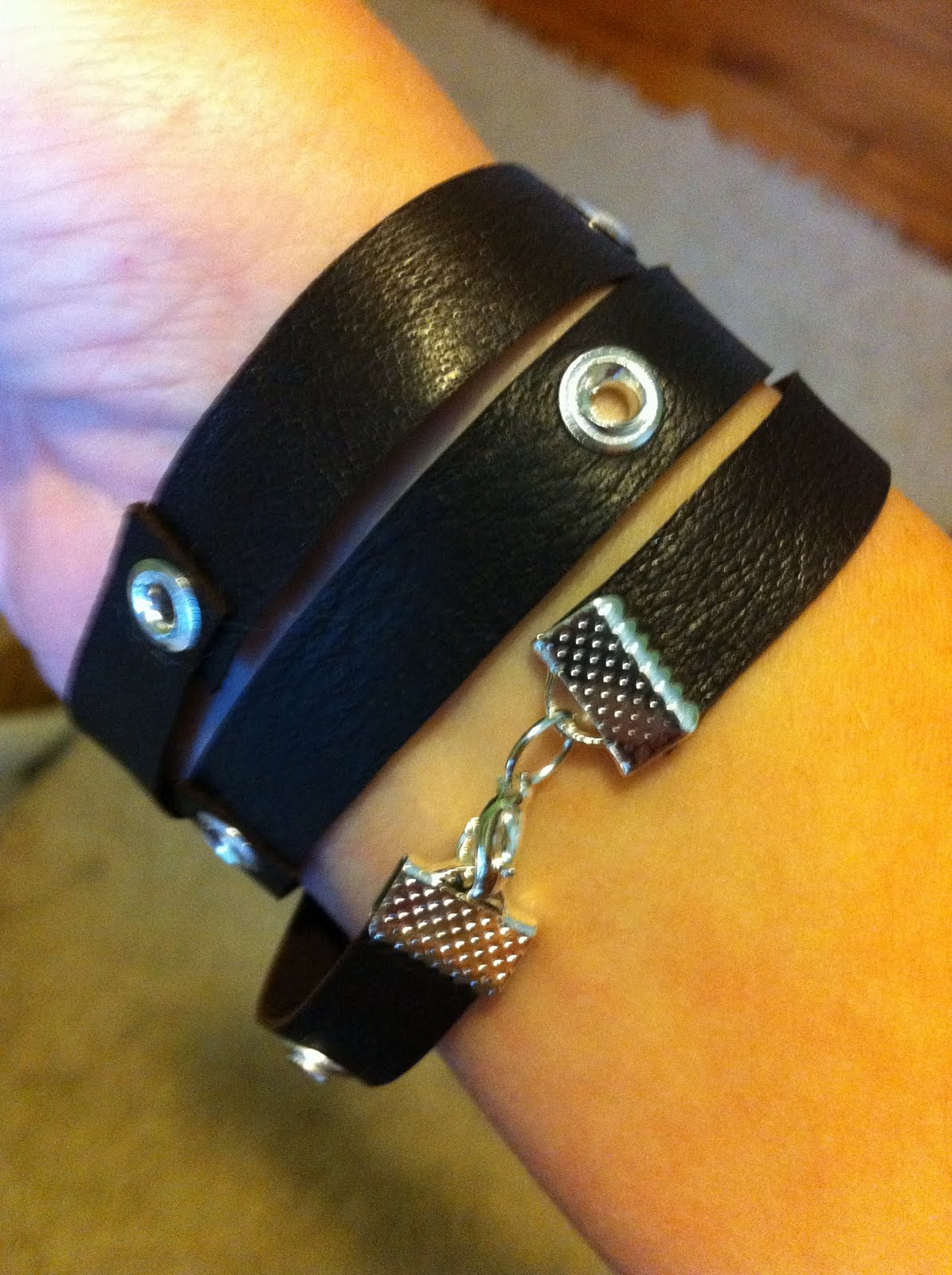 After that I put a ribbon clamp on one end, wrapped around my wrist to determine the right length, trimmed a little off the leather, and then added the other clamp with clasp.