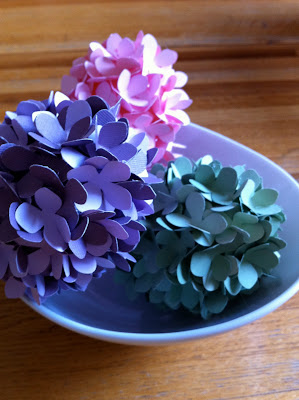 Last month I made a hydrangea wreath out of paper and my handy Martha Stewart hydrangea punch ... and I knew I wasn't going to be able to stop myself from plastering petals on some other objects. My original inspiration came from fabric flower covered eggs at Pottery Barn, so eggs were what I did next.